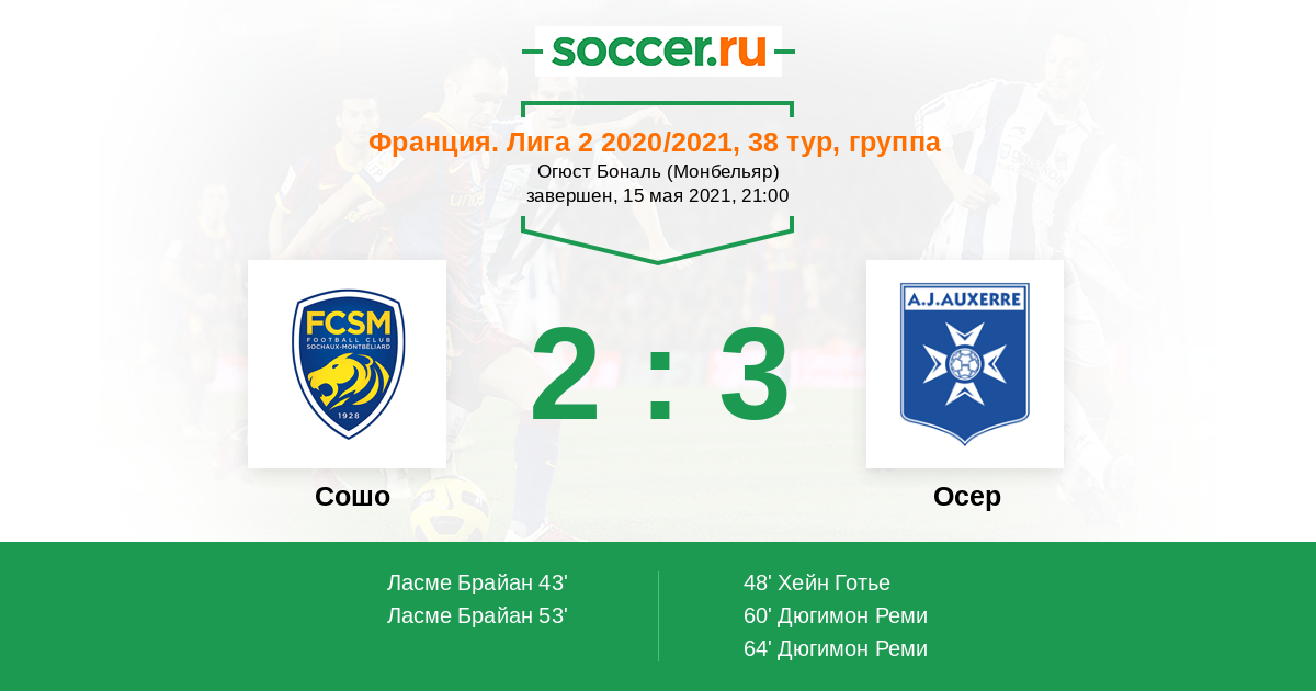 Франция. Лига 2 29.04.2016 Сошо Логотип футбольный клуб Сошо (Монбельяр) 2:3 Логотип футбольный клуб Осер Осер
