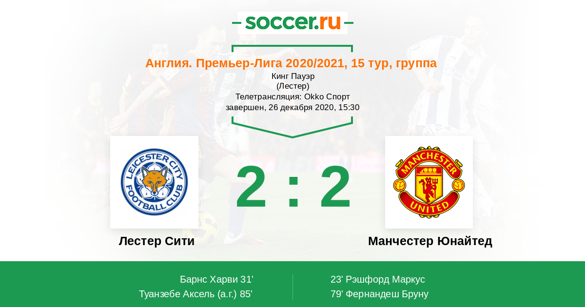 Англия. Премьер-Лига 23.12.2017 Лестер Сити Логотип футбольный клуб Лестер Сити 2:2 Логотип футбольный клуб Манчестер Юнайтед Манчестер Юнайтед
