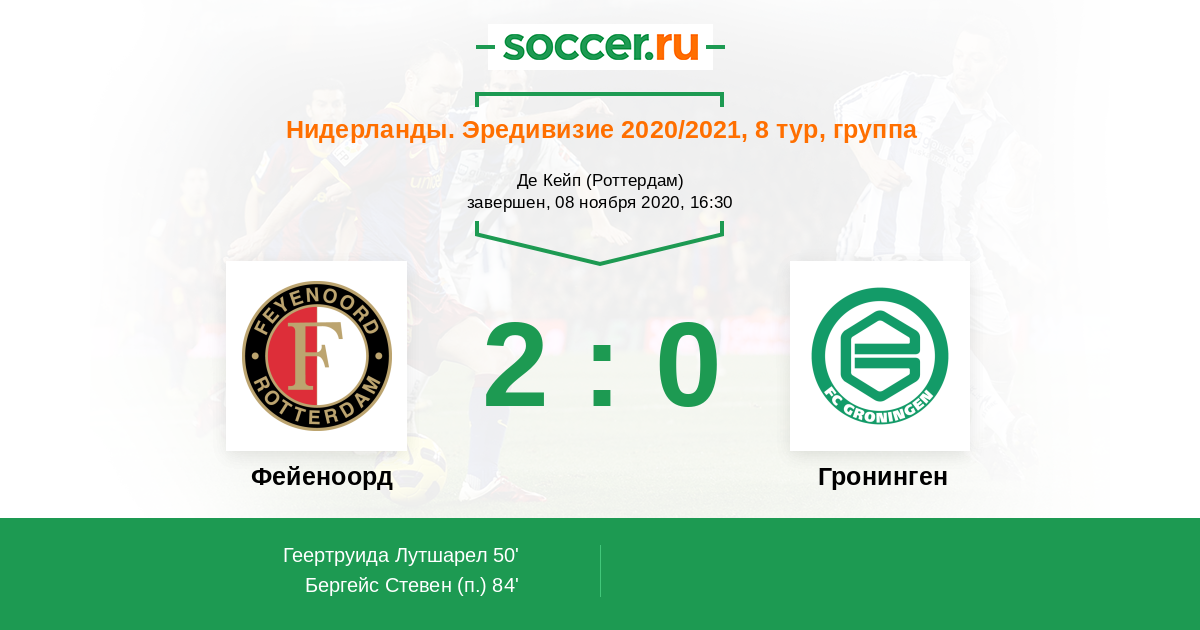 Нидерланды. Эредивизи 05.03.2022 Фейеноорд Логотип футбольный клуб Фейеноорд (Роттердам) 1:1 Логотип футбольный клуб Гронинген Гронинген