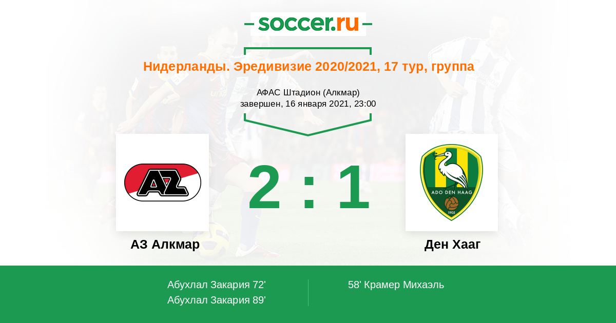 Нидерланды. Эредивизи 25.10.2020 Ден Хааг Логотип футбольный клуб Ден Хааг (Гаага) 2:2 Логотип футбольный клуб АЗ Алкмар АЗ Алкмар
