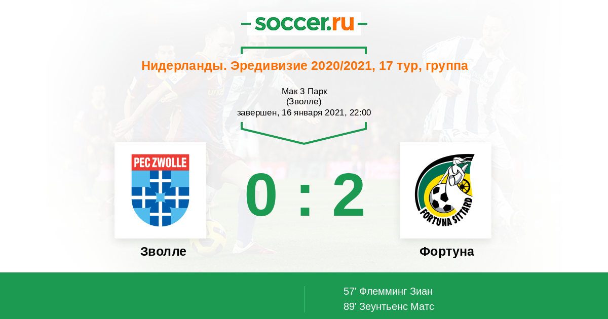 Нидерланды. Эредивизи 06.03.2022 Фортуна Логотип футбольный клуб Фортуна (Ситтард) 0:1 Логотип футбольный клуб Зволле Зволле