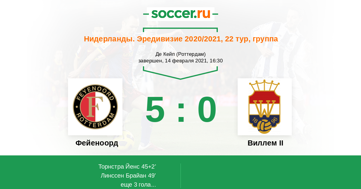 Нидерланды. Эредивизи 21.01.2017 Фейеноорд Логотип футбольный клуб Фейеноорд (Роттердам) 1:0 Логотип футбольный клуб Виллем II (Тилбург) Виллем II