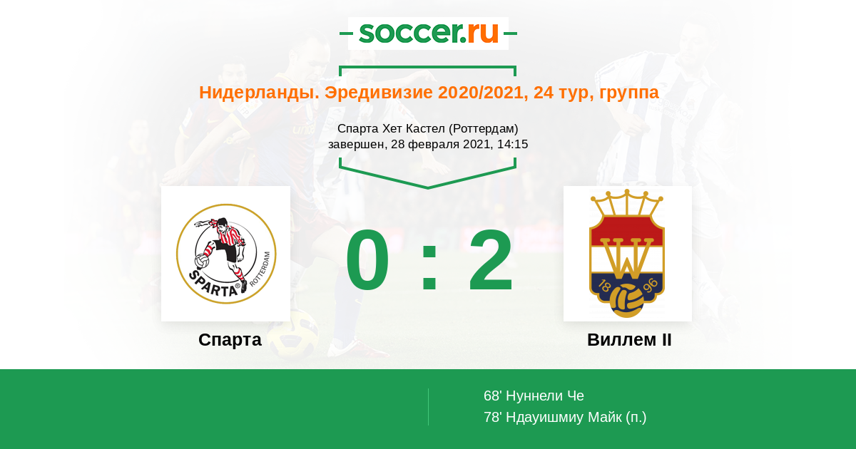 Нидерланды. Эредивизи 13.02.2022 Спарта Логотип футбольный клуб Спарта (Роттердам) 1:0 Логотип футбольный клуб Виллем II (Тилбург) Виллем II