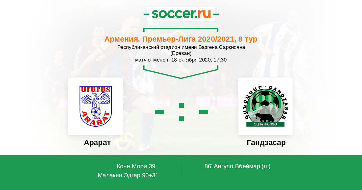 Армения. Премьер-лига 22.09.2018 Гандзасар Логотип футбольный клуб Гандзасар (Капан) 4:0 Логотип футбольный клуб Арарат (Ереван) Арарат