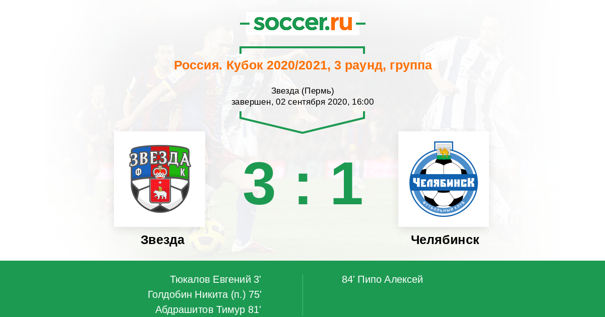 Россия. Вторая лига. Группа 4 27.09.2020 Челябинск Логотип футбольный клуб Челябинск 3:0 Логотип футбольный клуб Звезда (Пермь) Звезда