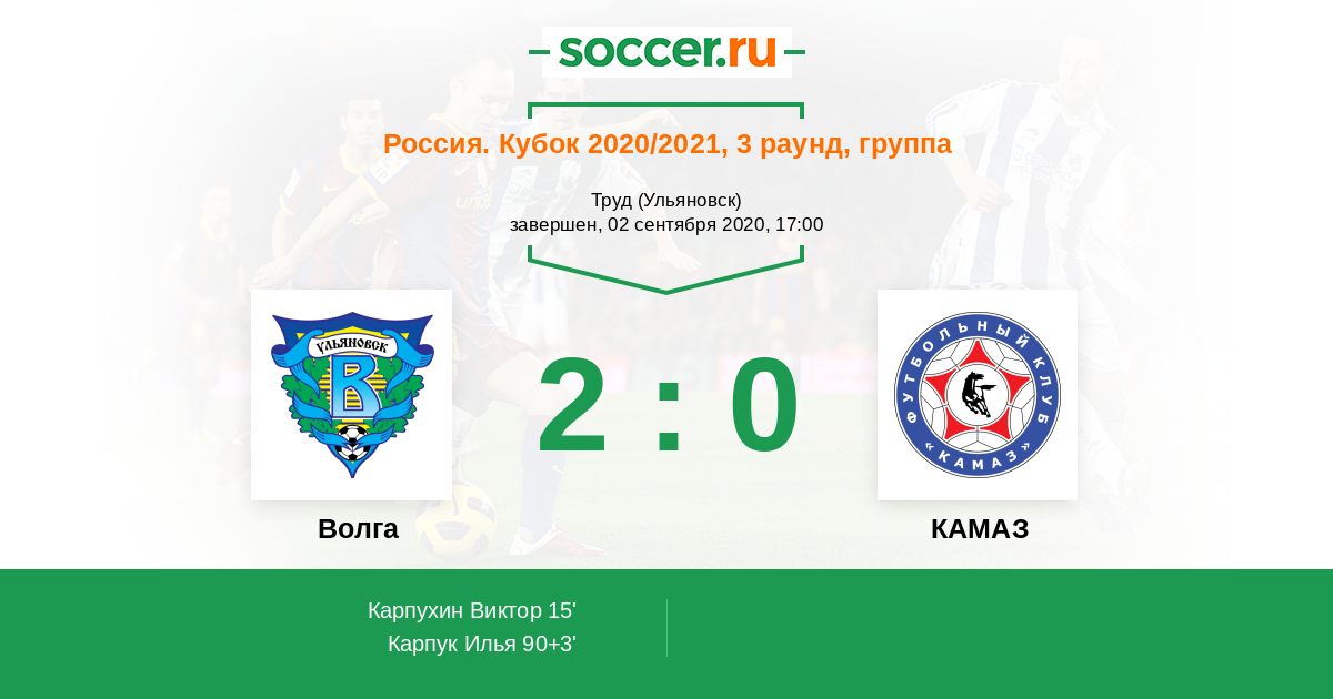 Россия. Вторая лига. Группа 4 12.09.2014 Волга Логотип футбольный клуб Волга (Ульяновск) 0:0 Логотип футбольный клуб КАМАЗ (Набережные Челны) КАМАЗ