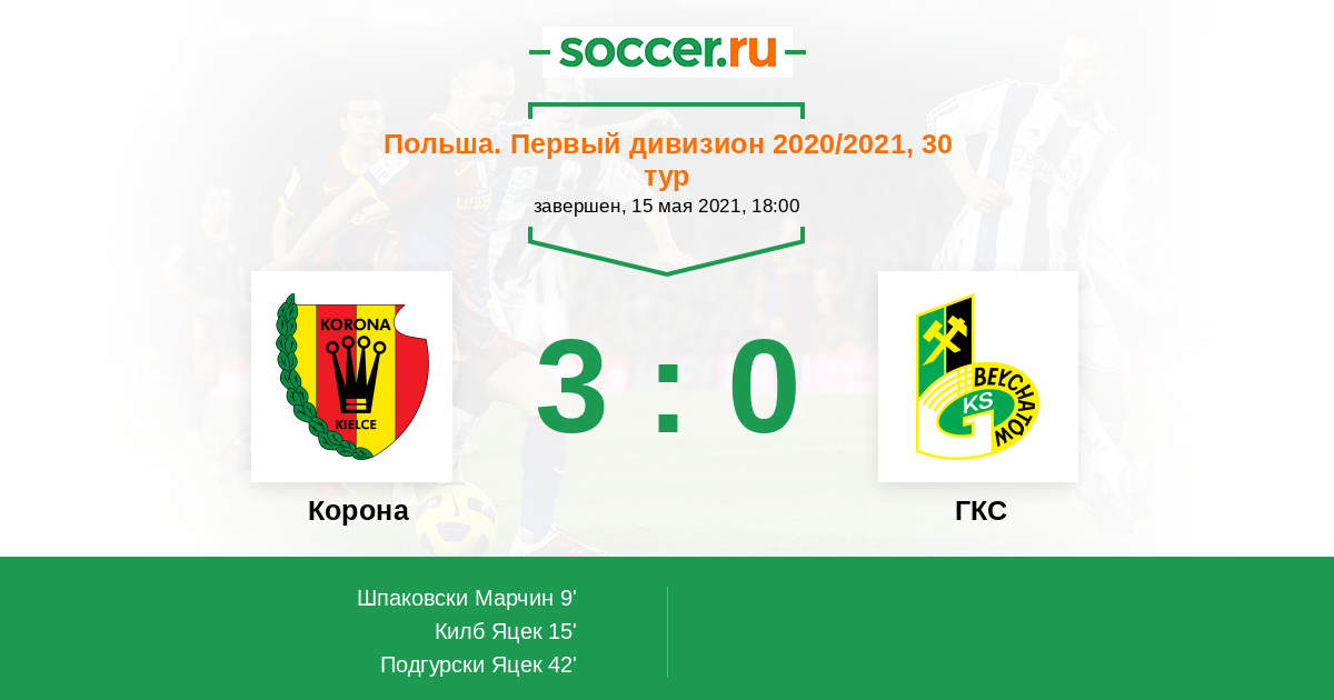 Польша. Экстракласса 02.06.2015 ГКС Логотип футбольный клуб ГКС (Белхатув) 2:2 Логотип футбольный клуб Корона (Кельце) Корона