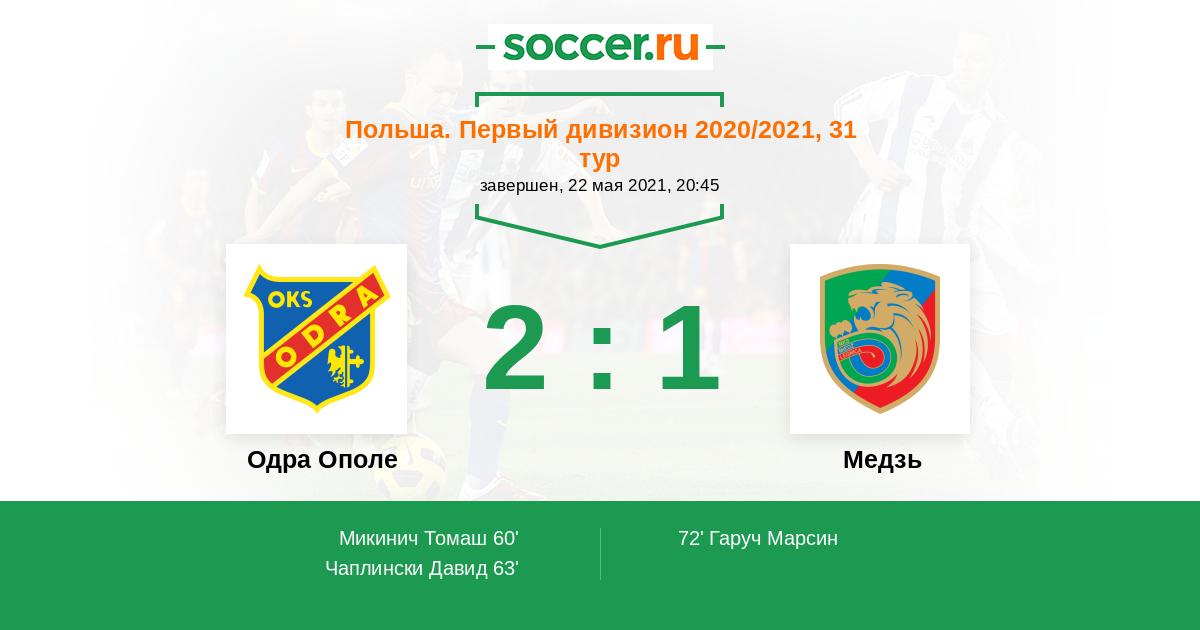 Польша. Первый дивизион 30.07.2021 Одра Ополе Логотип футбольный клуб Одра Ополе 1:4 Логотип футбольный клуб Медзь (Легница) Медзь