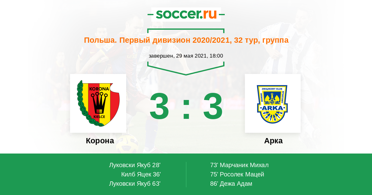 Польша. Экстракласса 03.07.2020 Корона Логотип футбольный клуб Корона (Кельце) 1:1 Логотип футбольный клуб Арка (Гдыня) Арка