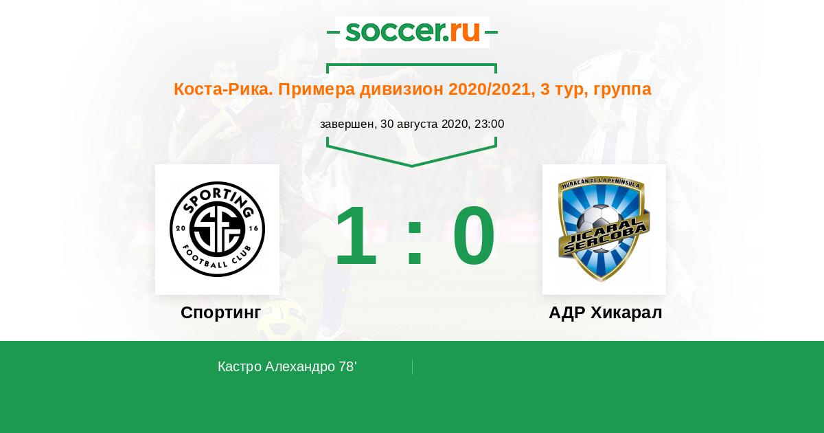 Коста-Рика. Примера дивизион 27.09.2020 АДР Хикарал Логотип футбольный клуб АДР Хикарал 3:1 Логотип футбольный клуб Спортинг Сан-Хосе Спортинг Сан-Хосе