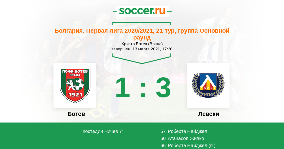 Болгария. Первая лига 08.03.2020 Ботев Логотип футбольный клуб Ботев (Враца) 0:0 Логотип футбольный клуб Левски (София) Левски