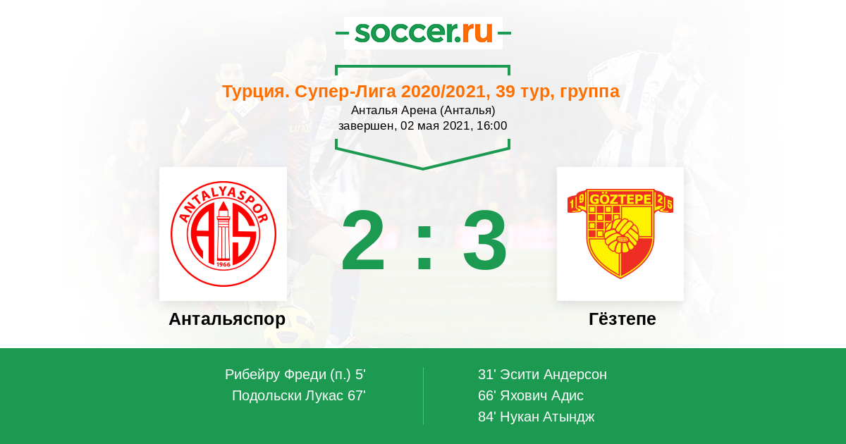 Турция. Суперлига 05.05.2019 Гёзтепе Логотип футбольный клуб Гёзтепе (Измир) 4:1 Логотип футбольный клуб Антальяспор Антальяспор