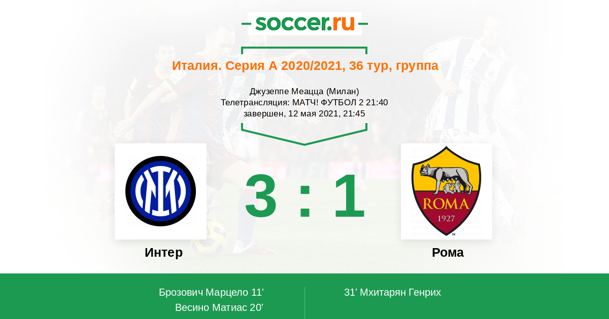 Добиться своего «нерадзурри» в итоге смогли – победа 2:0 над «Кротоне» в 34 туре официально сделала их чемпионом Италии. Однако расслабляться «Интер» даже не думал – в последнем туре уже в статусе чемпиона подопечные Конте не оставили шансов «Сампдории», обыграв соперника со счетом 5:1 на своем поле. Победа продлила серию «Интера» без поражений в чемпионате до 19 матчей. «Интер» не позволил себе расслабиться в поединке с «Сампдорией» и добыл уверенную победу, но сегодня ему предстоит столкнуться с более серьезным соперником. «Роме» после ряда провалов есть что доказывать. В последнем поединке с «Кротоне» римляне выглядели вполне убедительно, с «Интером» «волки» играют успешно, шансы на очки у них определенно есть.