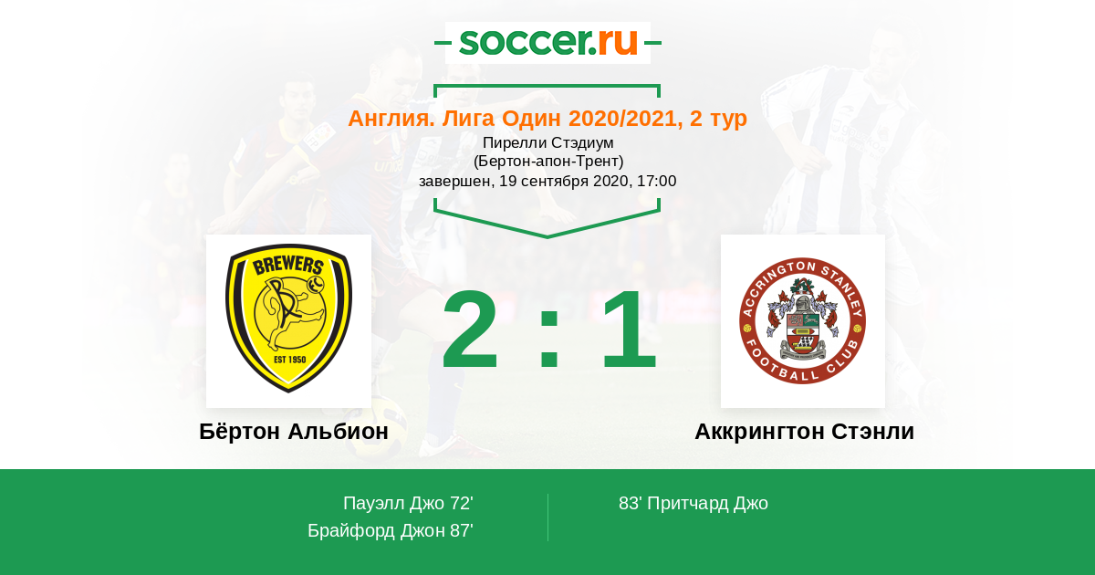Англия. Первая Футбольная Лига 02.04.2021 Аккрингтон Стэнли Логотип футбольный клуб Аккрингтон Стэнли 0:0 Логотип футбольный клуб Бёртон Альбион (Бёртон-апон-Трент) Бёртон Альбион