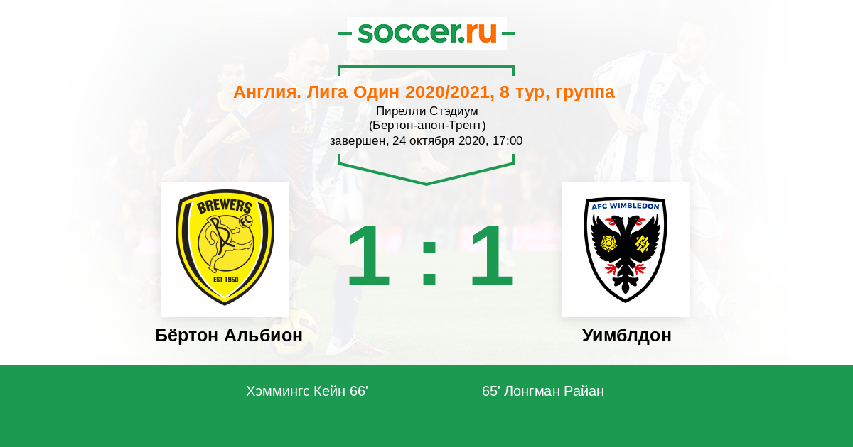 Англия. Первая Футбольная Лига 02.10.2021 Уимблдон Логотип футбольный клуб Уимблдон (Лондон) 1:1 Логотип футбольный клуб Бёртон Альбион (Бёртон-апон-Трент) Бёртон Альбион