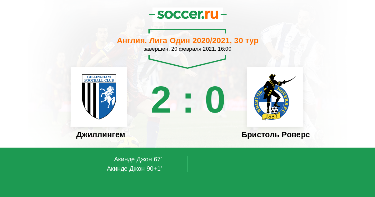Англия. Первая Футбольная Лига 02.12.2020 Бристоль Роверс Логотип футбольный клуб Бристоль Роверс 0:2 Логотип футбольный клуб Джиллингем Джиллингем