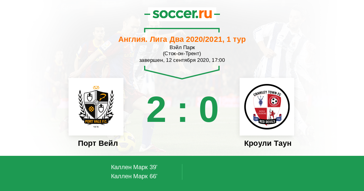 Англия. Вторая Футбольная Лига 18.08.2018 Порт Вейл Логотип футбольный клуб Порт Вейл (Сток-он-Трент) 1:0 Логотип футбольный клуб Кроули Таун Кроули Таун