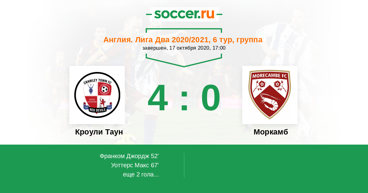Англия. Вторая Футбольная Лига 07.10.2017 Моркамб Логотип футбольный клуб Моркамб 0:1 Логотип футбольный клуб Кроули Таун Кроули Таун