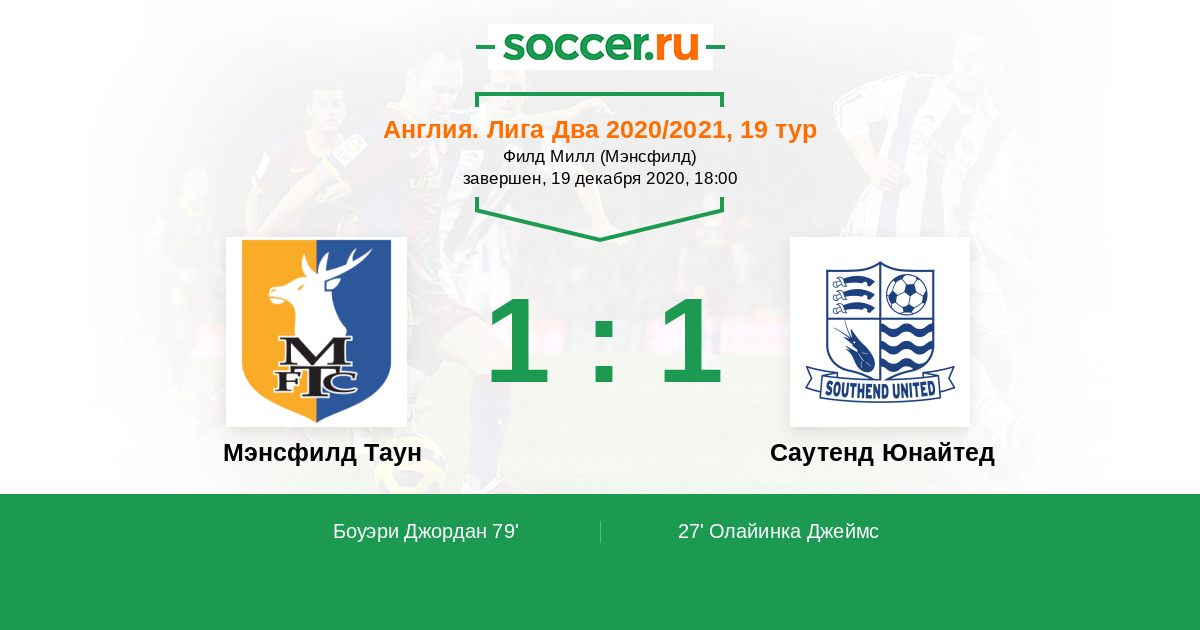 Англия. Вторая Футбольная Лига 23.01.2021 Саутенд Юнайтед Логотип футбольный клуб Саутенд Юнайтед (Саутенд-он-Си) 0:1 Логотип футбольный клуб Мэнсфилд Таун Мэнсфилд Таун