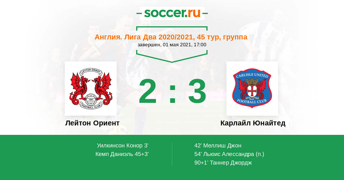 Англия. Вторая Футбольная Лига 23.03.2021 Карлайл Юнайтед Логотип футбольный клуб Карлайл Юнайтед (Карлайсл) 0:1 Логотип футбольный клуб Лейтон Ориент Лейтон Ориент