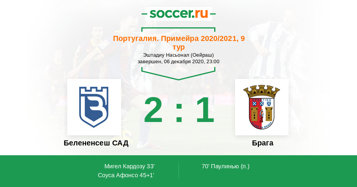 Португалия. Примейра 20.12.2021 Брага Логотип футбольный клуб Брага 1:0 Логотип футбольный клуб Белененсеш САД (Лиссабон) Белененсеш САД
