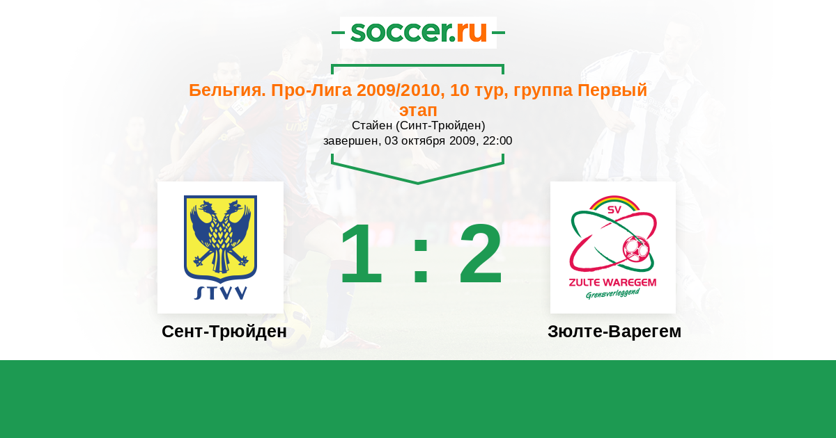 Бельгия. Про-Лига 31.03.2010 Зюлте-Варегем Логотип футбольный клуб Зюлте-Варегем 1:2 Логотип футбольный клуб Сент-Трюйден (Синт-Трёйден) Сент-Трюйден