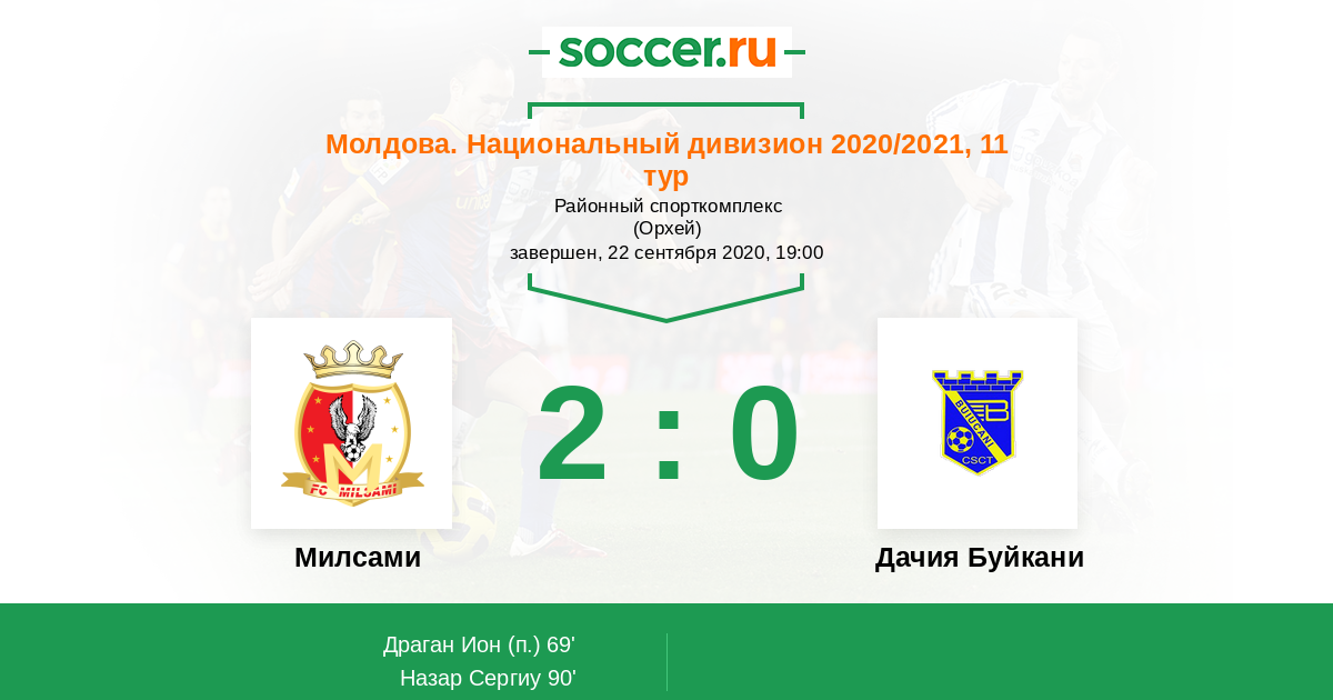 Молдова. Национальный дивизион 26.11.2020 Дачия Буйкани Логотип футбольный клуб Дачия Буйкани (Кишинев) 0:0 Логотип футбольный клуб Милсами (Оргеев) Милсами