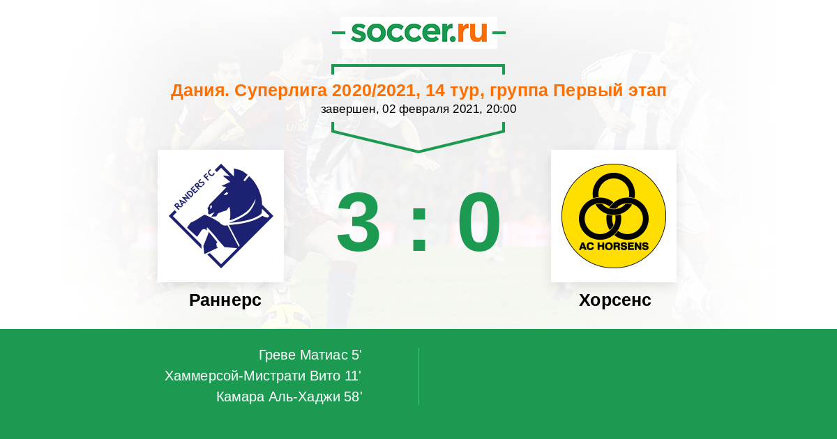 Дания. Суперлига 13.09.2020 Хорсенс Логотип футбольный клуб Хорсенс 0:3 Логотип футбольный клуб Раннерс Раннерс