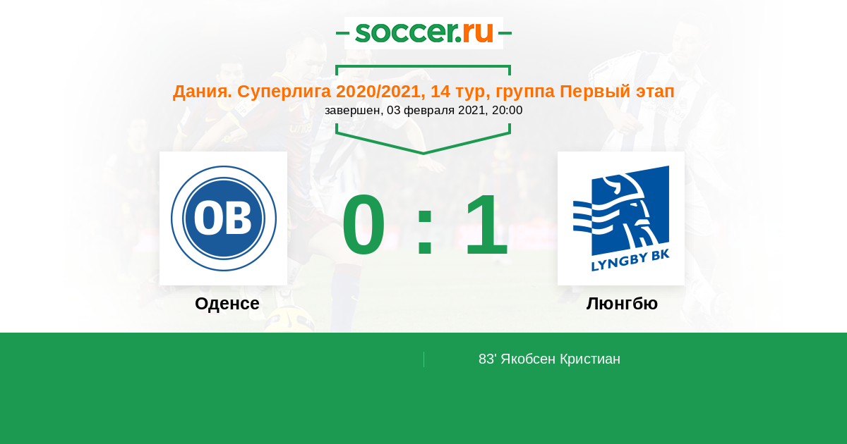 Дания. Суперлига 22.06.2020 Люнгбю Логотип футбольный клуб Люнгбю (Конгес Люнгбю) 1:2 Логотип футбольный клуб Оденсе Оденсе