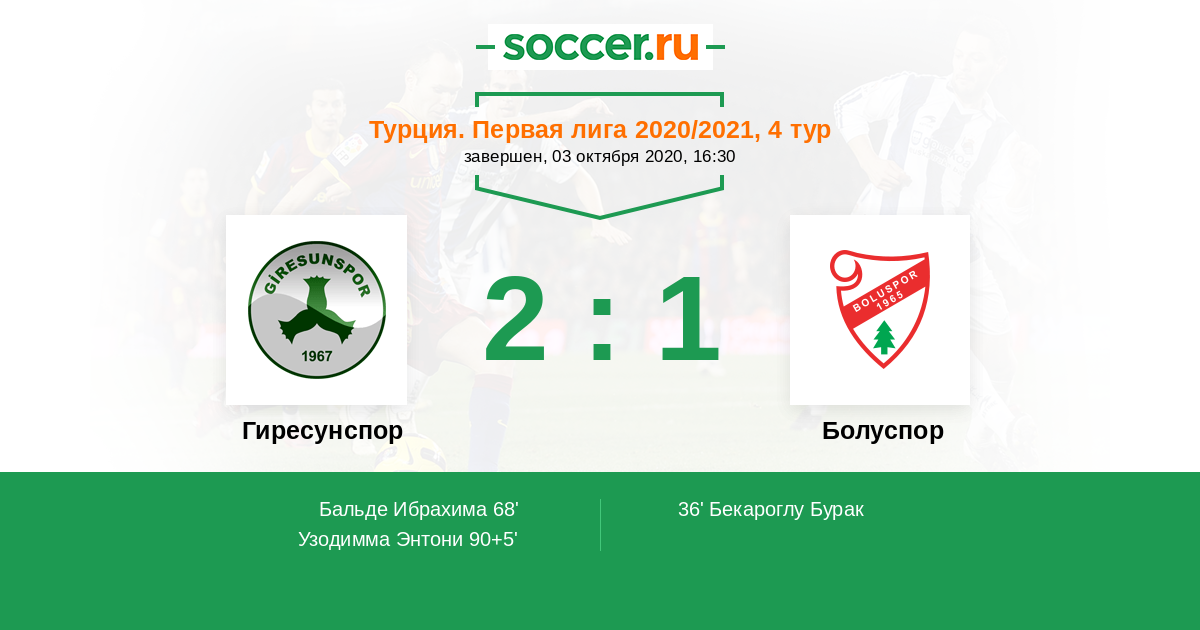 Турция. Первая лига 20.10.2019 Болуспор Логотип футбольный клуб Болуспор 2:0 Логотип футбольный клуб Гиресунспор Гиресунспор