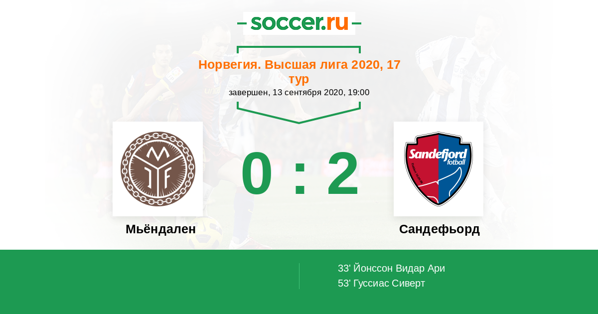 Норвегия. Высшая лига 26.07.2020 Сандефьорд Логотип футбольный клуб Сандефьорд 1:0 Логотип футбольный клуб Мьёндален Мьёндален