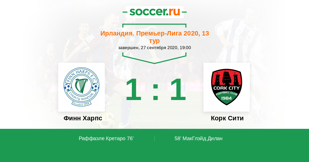 Ирландия. Премьер-лига 20.09.2019 Корк Сити Логотип футбольный клуб Корк Сити 0:0 Логотип футбольный клуб Финн Харпс (Баллибофи) Финн Харпс