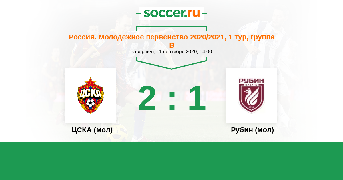 Россия. Премьер-Лига U21 15.12.2020 Рубин (мол) Логотип футбольный клуб Рубин (мол) (Казань) 1:2 Логотип футбольный клуб ЦСКА (мол) (Москва) ЦСКА (мол)