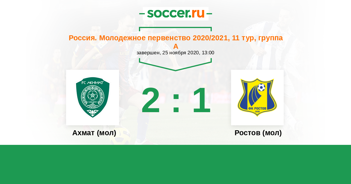 Россия. Премьер-Лига U21 20.08.2021 Ростов (мол) Логотип футбольный клуб Ростов (мол) (Ростов-на-Дону) 5:0 Логотип футбольный клуб Ахмат (мол) (Грозный) Ахмат (мол)