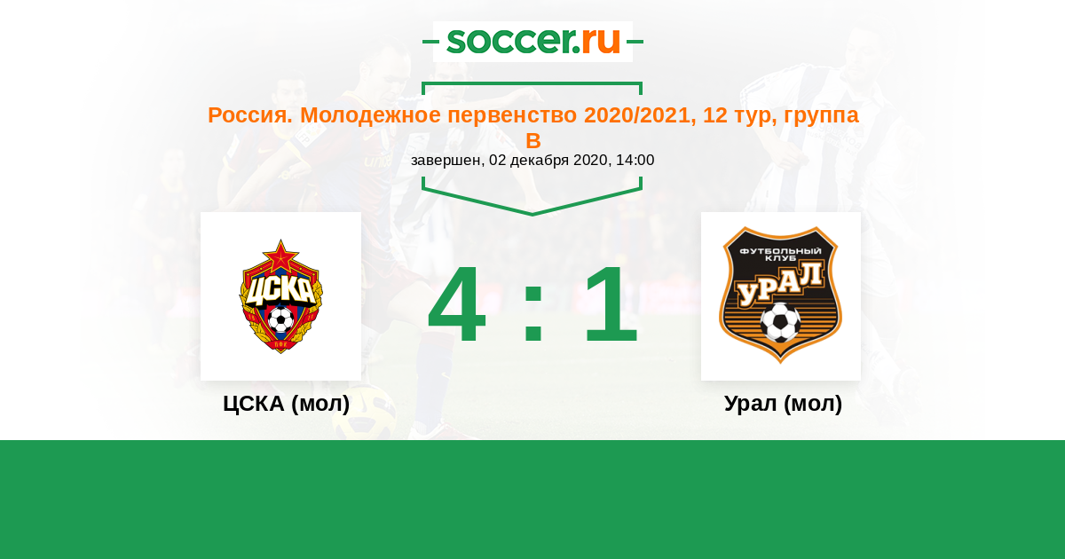 Россия. Премьер-Лига U21 16.03.2019 Урал (мол) Логотип футбольный клуб Урал (мол) (Екатеринбург) 2:6 Логотип футбольный клуб ЦСКА (мол) (Москва) ЦСКА (мол)