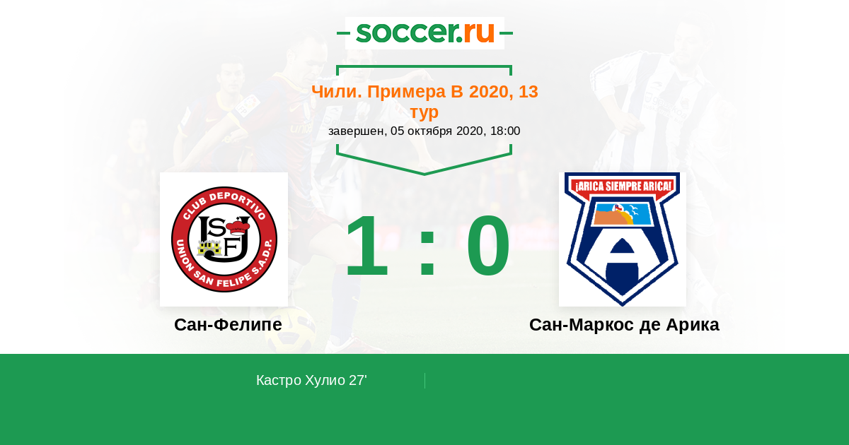 Чили. Примера В 11.09.2016 Сан-Маркос де Арика Логотип футбольный клуб Сан-Маркос де Арика 1:0 Логотип футбольный клуб Сан-Фелипе (Сан Фелипе) Сан-Фелипе