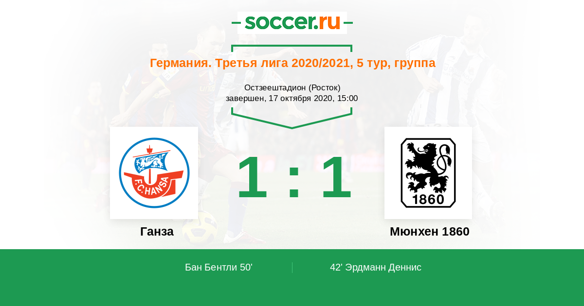 Германия. Третья лига 26.10.2019 Ганза Логотип футбольный клуб Ганза (Росток) 2:1 Логотип футбольный клуб Мюнхен 1860 Мюнхен 1860
