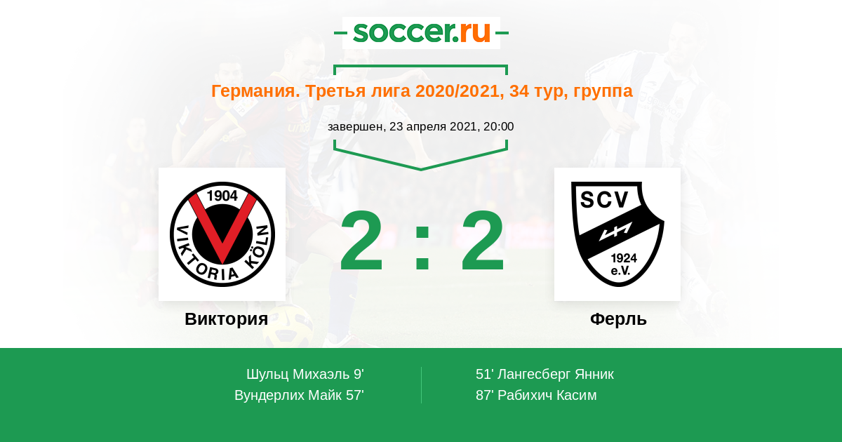 Германия. Лига 4: Север 03.05.2013 Ферль Логотип футбольный клуб Ферль 2:2 Логотип футбольный клуб Виктория (Кельн) Виктория