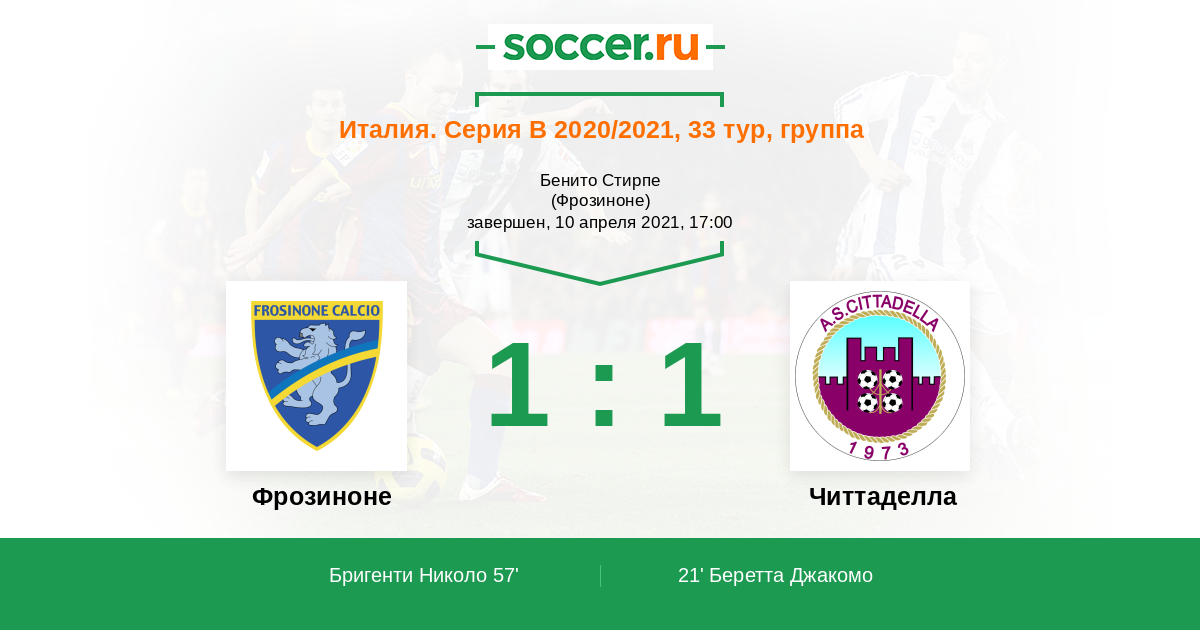 Италия. Серия В 02.10.2021 Фрозиноне Логотип футбольный клуб Фрозиноне 0:1 Логотип футбольный клуб Читтаделла Читтаделла