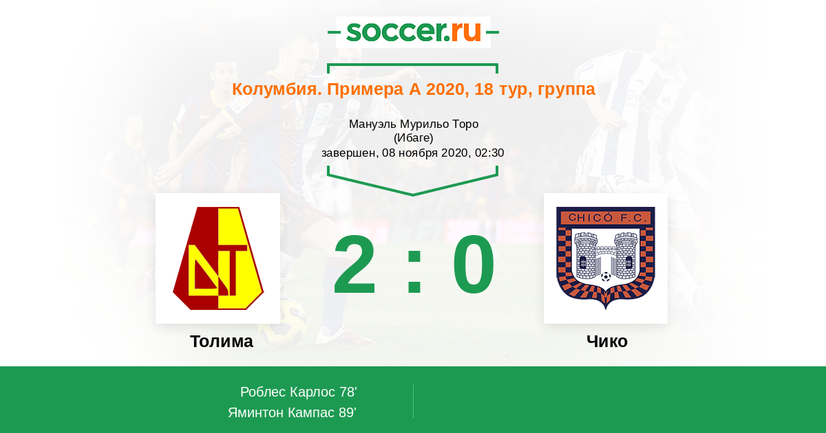 Колумбия. Примера А 08.09.2018 Чико Логотип футбольный клуб Чико (Тунха) 2:1 Логотип футбольный клуб Толима (Ибаге) Толима