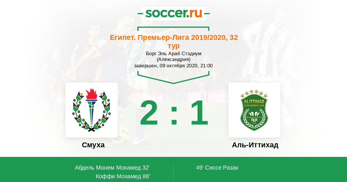 Египет. Премьер-Лига 01.05.2021 Смуха Логотип футбольный клуб Смуха (Александрия) 2:2 Логотип футбольный клуб Аль-Иттихад (Александрия) Аль-Иттихад