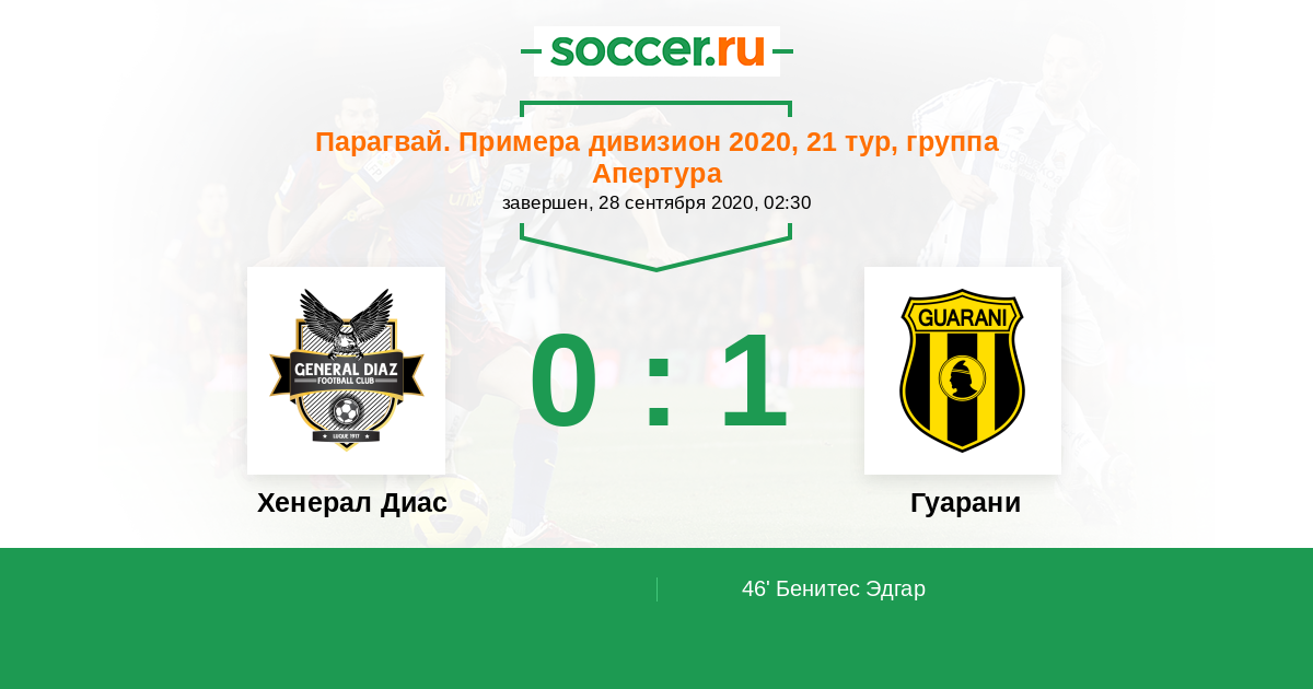 Парагвай. Примера дивизион 07.11.2020 Гуарани Логотип футбольный клуб Гуарани (Асунсьон) 2:0 Логотип футбольный клуб Хенерал Диас (Луке) Хенерал Диас