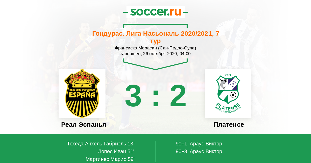 Гондурас. Лига Насьональ 16.03.2020 Платенсе Логотип футбольный клуб Платенсе (Пуэрто Кортес) 2:1 Логотип футбольный клуб Реал Эспанья (Сан-Педро-Сула) Реал Эспанья