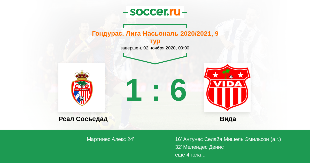 Гондурас. Лига Насьональ 15.10.2020 Вида Логотип футбольный клуб Вида (Ла-Сейба) 1:0 Логотип футбольный клуб Реал Сосьедад (Токоа) Реал Сосьедад