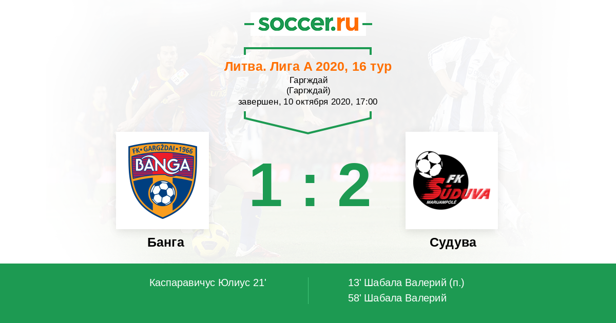 Литва. Лига А 26.09.2021 Судува Логотип футбольный клуб Судува (Мариямполе) 4:0 Логотип футбольный клуб Банга (Гаргждай) Банга
