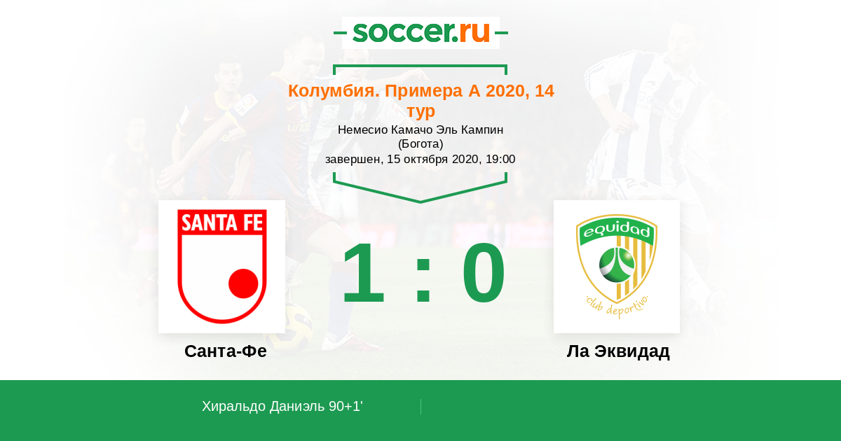 Колумбия. Примера А 15.10.2020 Санта-Фе Логотип футбольный клуб Санта-Фе (Богота) 1:0 Логотип футбольный клуб Ла Эквидад (Богота) Ла Эквидад