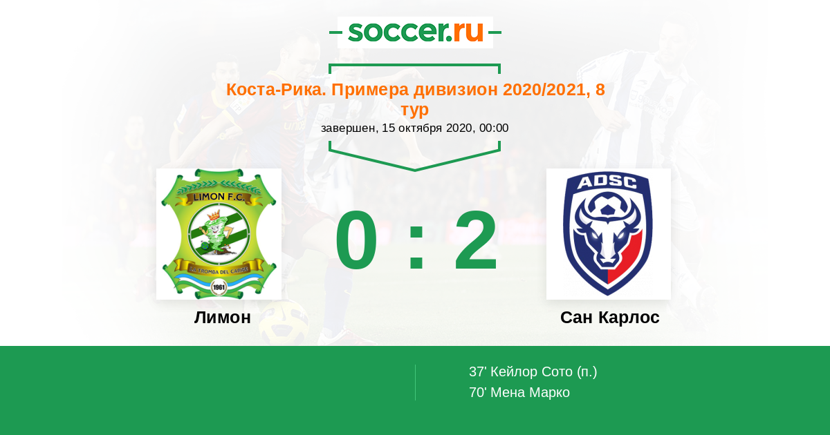 Коста-Рика. Примера дивизион 01.03.2021 Сан Карлос Логотип футбольный клуб Сан Карлос (Сьюдад Куэсада) 0:3 Логотип футбольный клуб Лимон Лимон
