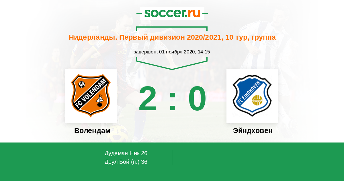 Нидерланды. Первый дивизион 30.10.2015 Волендам Логотип футбольный клуб Волендам 1:2 Логотип футбольный клуб Эйндховен Эйндховен