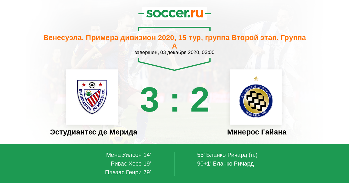 Венесуэла. Примера дивизион 01.09.2013 Минерос Гайана Логотип футбольный клуб Минерос Гайана 3:0 Логотип футбольный клуб Эстудиантес Мерида Эстудиантес Мерида