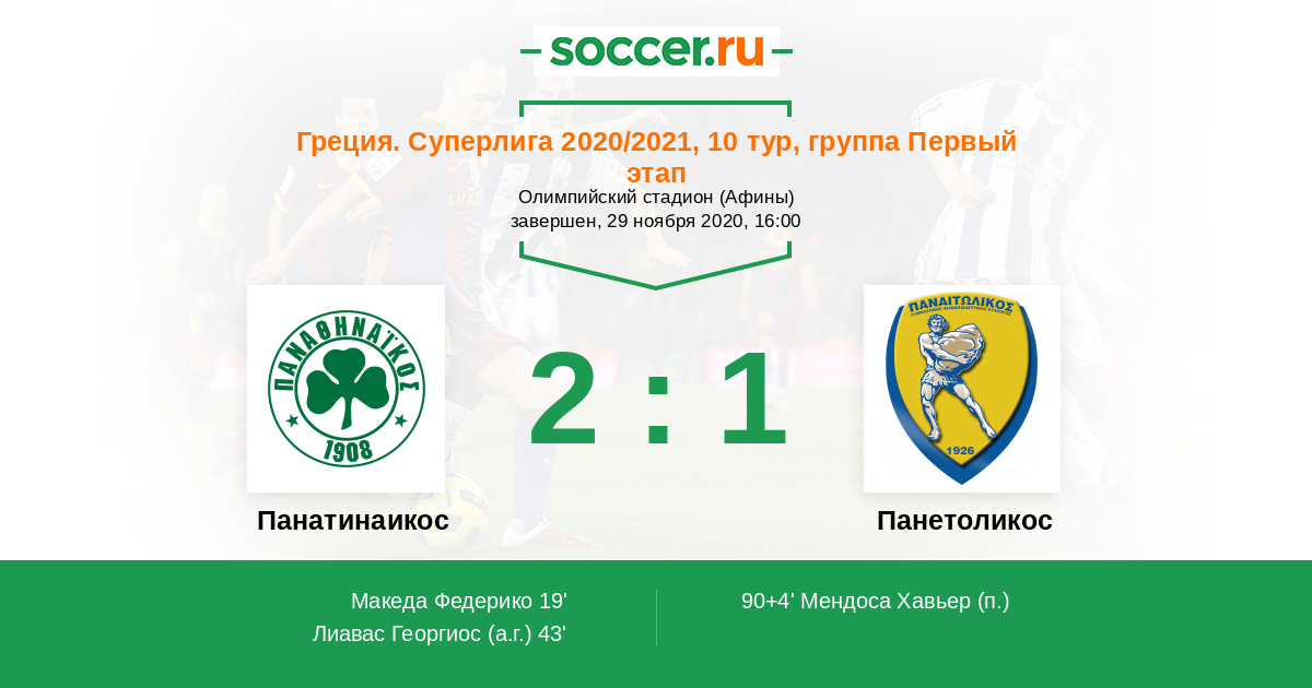 Греция. Суперлига 28.11.2021 Панатинаикос Логотип футбольный клуб Панатинаикос (Афины) 2:0 Логотип футбольный клуб Панетоликос (Агринио) Панетоликос
